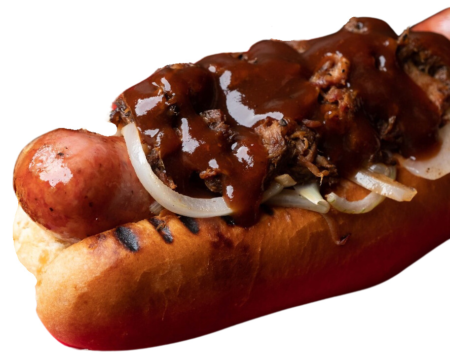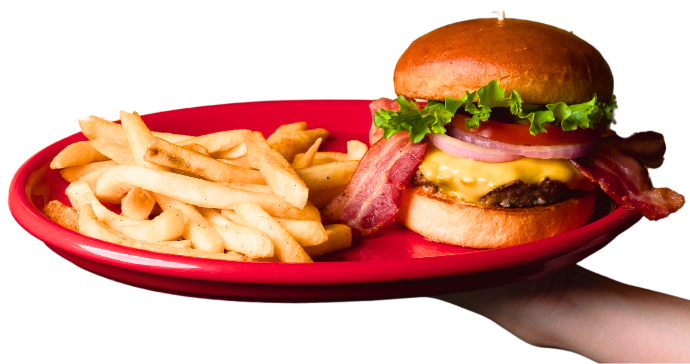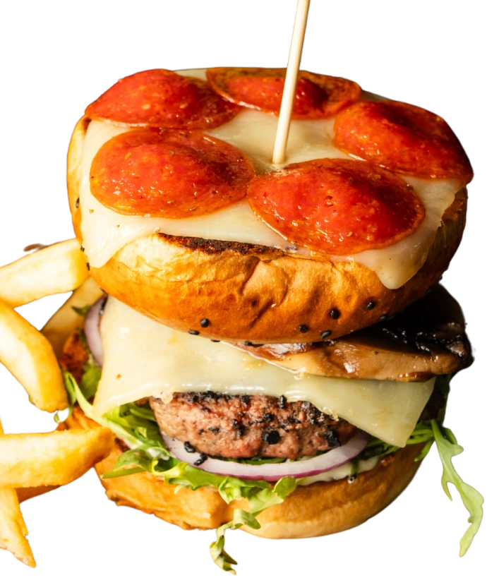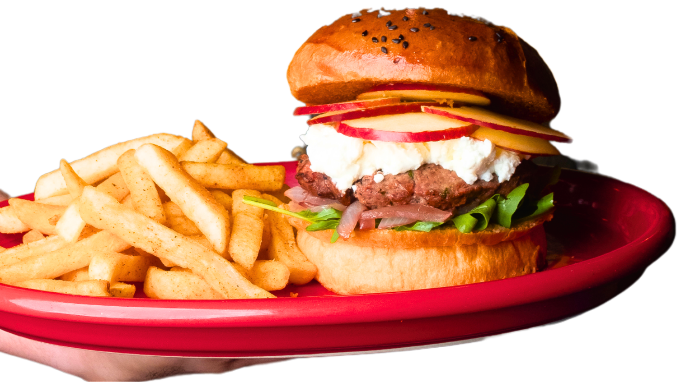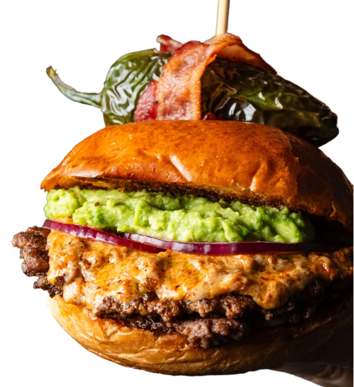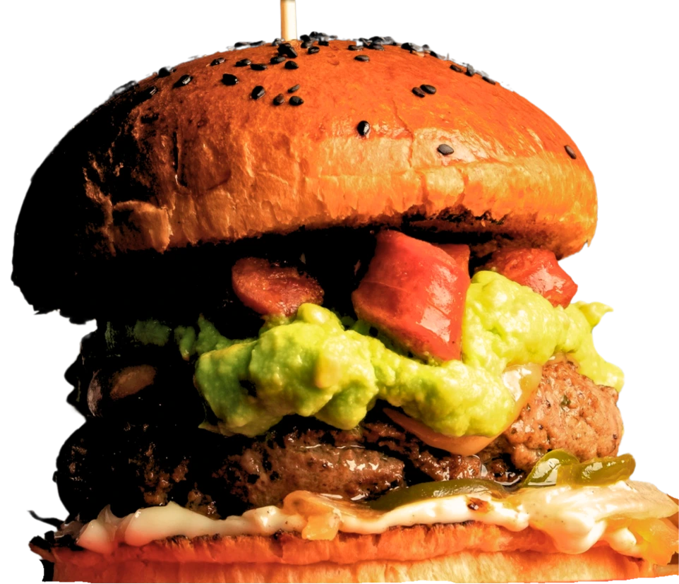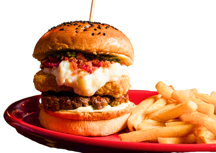 Burger con puré de papa, cheddar empanizado, tocino en trocitos y pesto de albaca.