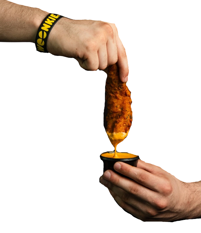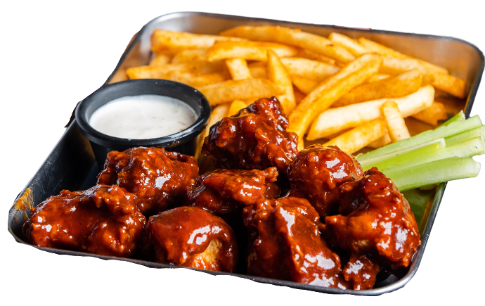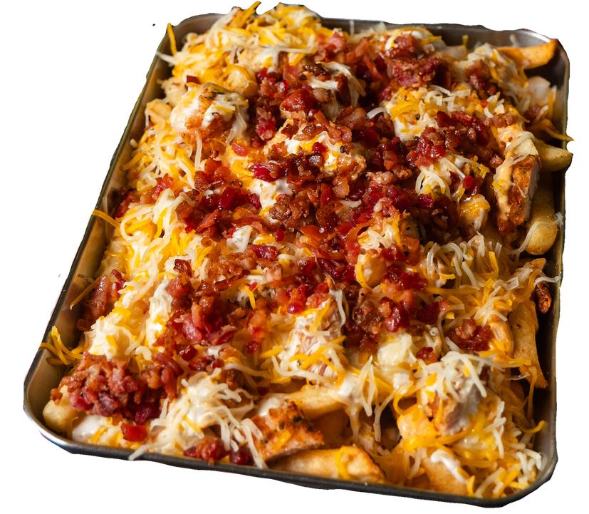 400 grs. de papas, pedacitos boneless, buffalo cream, aderezo blue cheese, tocino y mix de cheddar-monterrey jack