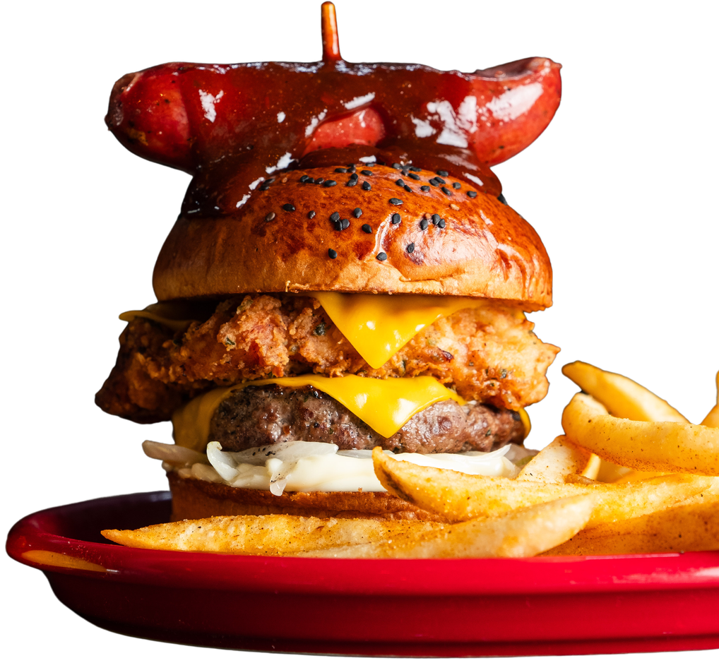 ¡La favorita del tío woonkie! Tan extravagante como única. Con queso chester, mermelada de frambuesa con tocino y crema de maní.