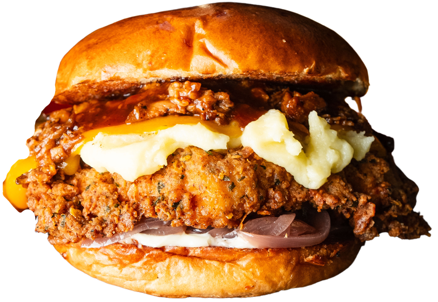 Burger con puré de papa, cheddar empanizado, tocino en trocitos y pesto de albahaca ¡una combinación única!