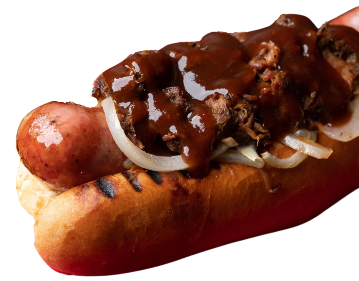 Salchicha ahumada jumbo, pulled pork, cebolla asada y bbq