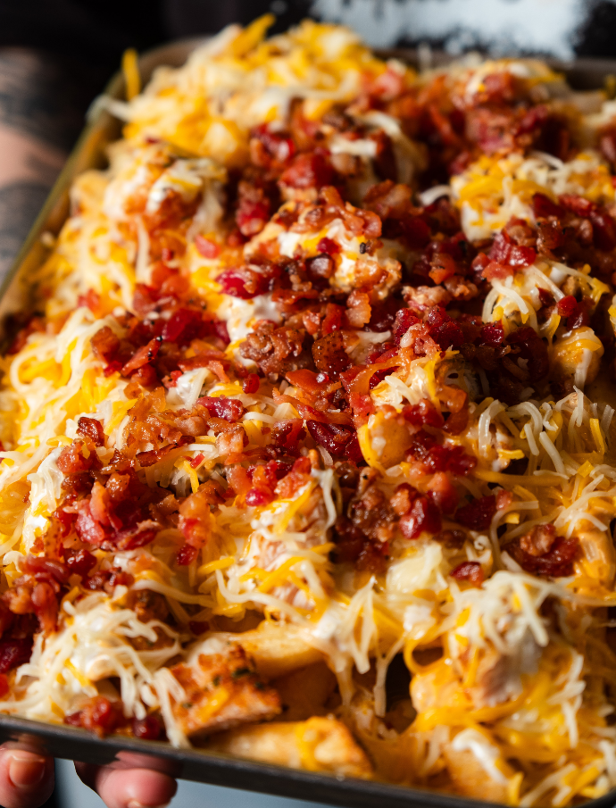 400 grs. de papas, pedacitos de boneless, buffalo cream, aderezo blue cheese, tocino y mix de cheddar-monterrey jack.