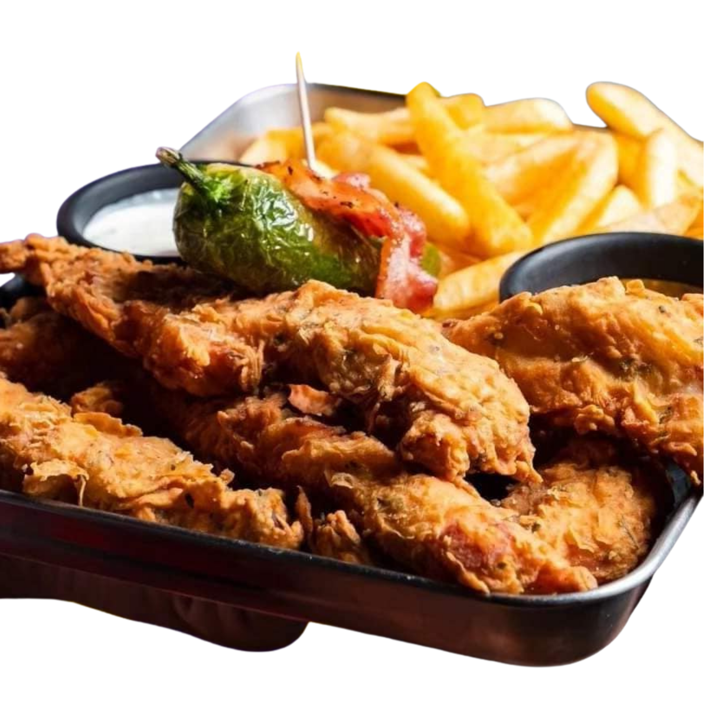 Los tenders que hicieron famosa nuestra línea Chicken Vairus. Acompañados de papas, chile toreado envuelto en tocino, aderezo buffalo cream y blue cheese.